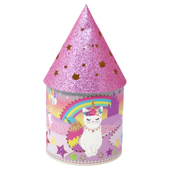 This soft illuminating light-up LED Lantern is designed to comfort children as they sleep. Switched on, watch as the light smoothly transitions between a rainbow of colours illuminating a dark room. Switched off it acts as a decorative piece with a glittering roof displaying beautiful illustrations of a fantasy land of Kitticorns and rainbows. Completely safe for little hands all day and all night long.