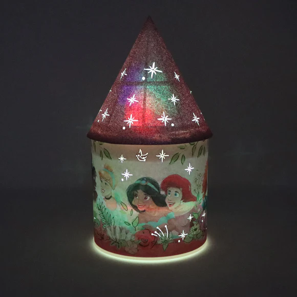 Inspired by ©Disney Princess. Light up a room with Disney Princess Forever Friends LED Colour Changing Lantern. Featuring stunning Disney Princess Illustrations with pink glitter rooftop. This soft illuminating lantern is designed to comfort children as they sleep. Watch as the light smoothly transitions between a rainbow of colours. Lights are LED so they do not get hot and are completely safe for little hands all day and night long.