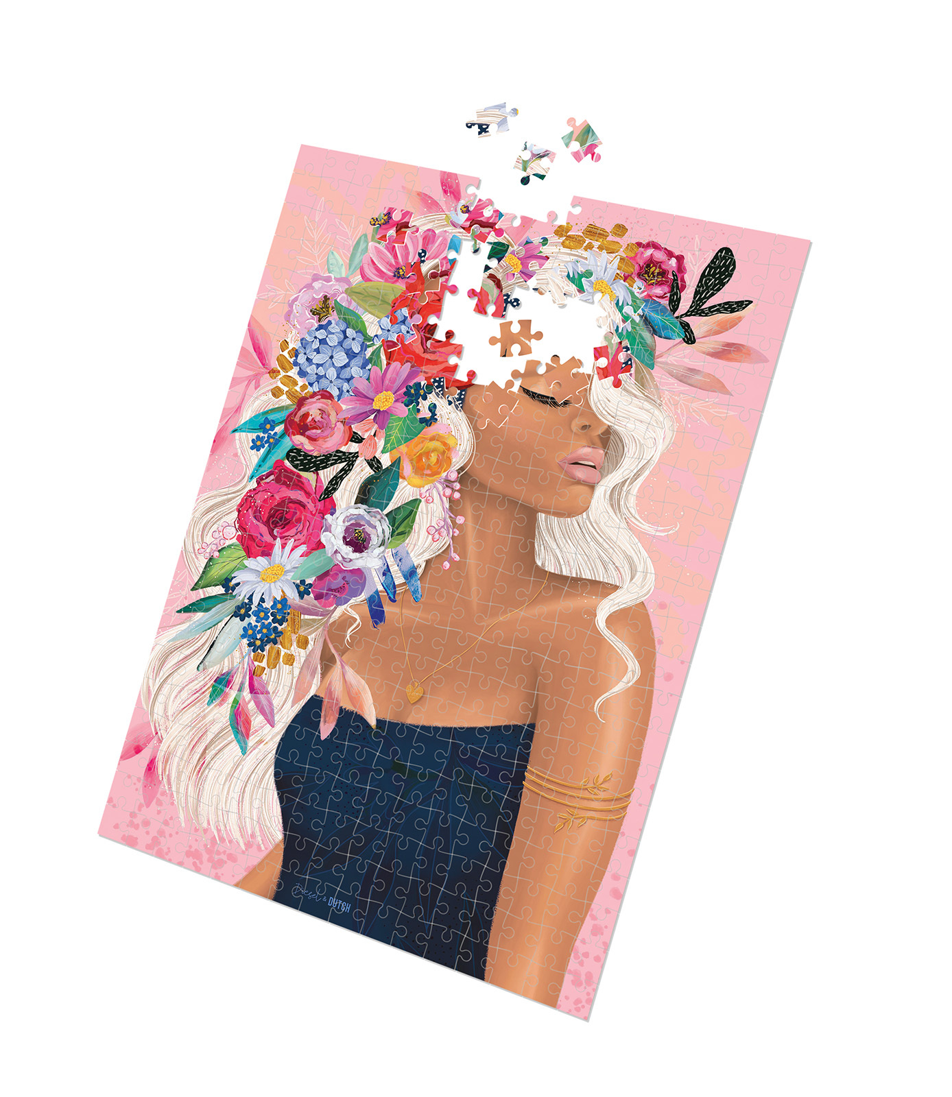 Adorned with a bouquet of flowers in her cascading hair, this peaceful female figure creates a sense of calming strength. Designed by Milly and Mae and titled “Lilah”, relax and enjoy puzzling as you settle in to piece her together.