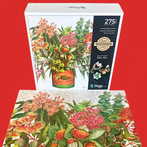 From the moment we saw this artwork, we knew that we wanted to create a puzzle from this image! It is an exact resemblance of all the beautiful and unique native plants and bushes that Australia has in their back gardens. We loved the tin that was used for the vase as it gave a cute quirkiness to the image and created some text which makes a fun build.