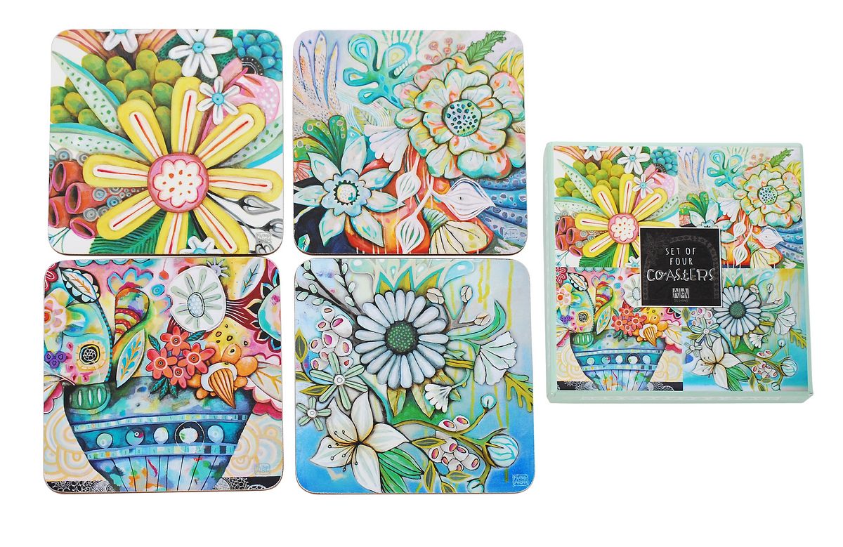 Set of 4, cork backed coasters. Gift boxed Size:10 x 10cm Printed from original drawings by Michelle Allen