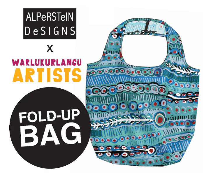 Fold up bag features artwork by Murdie Nampijinpa Morris, from Warlukurlangu Artists. Established in 1985 Warlukurlangu Artists Aboriginal Corporation is a not-for-profit organisation that is 100% Aboriginal-owned by its artists from the remote desert communities of Yuendumu and Nyirripi in Central Australia.