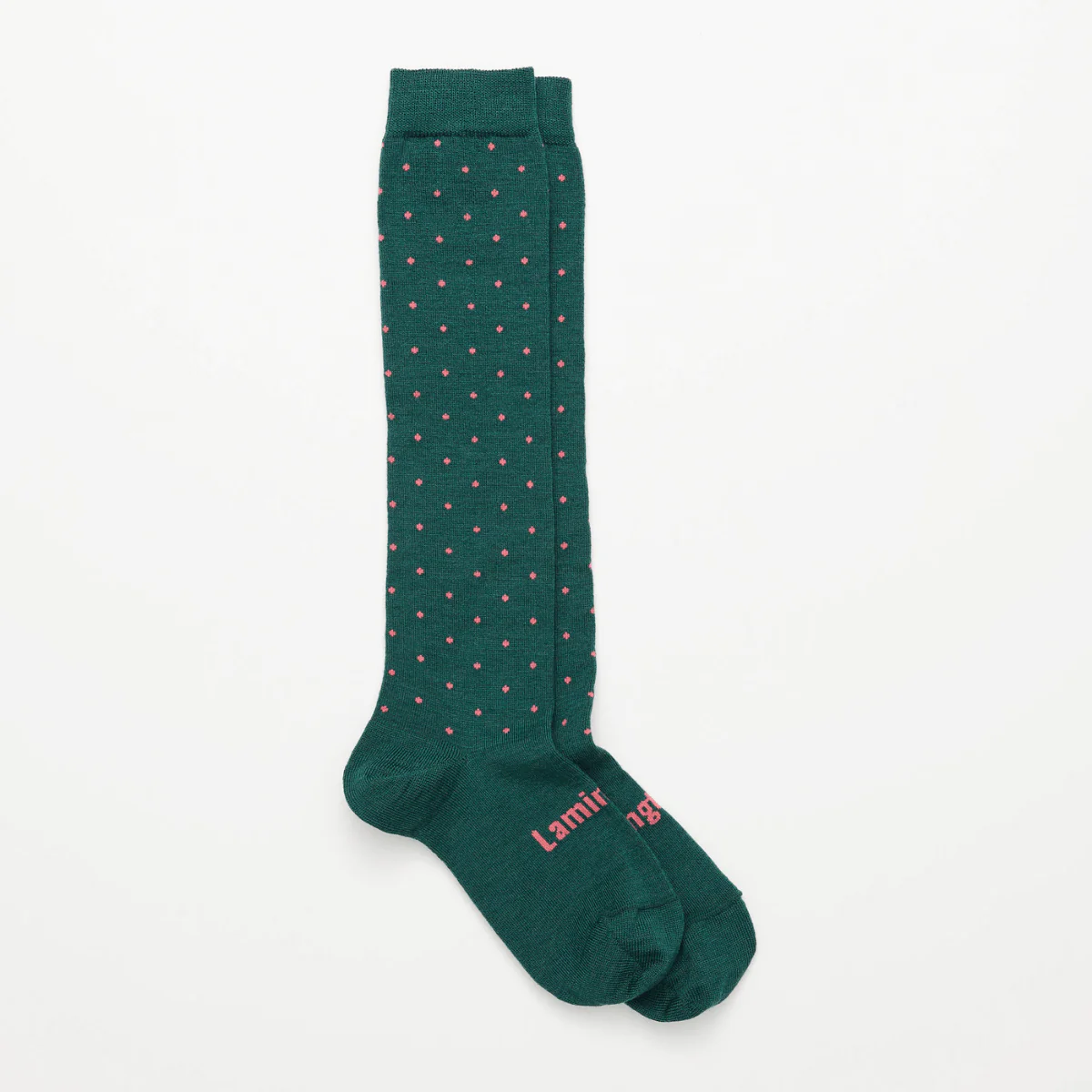 Brighton – Blackboard green with small chrysanthemum spots merino wool knee-high socks for women.